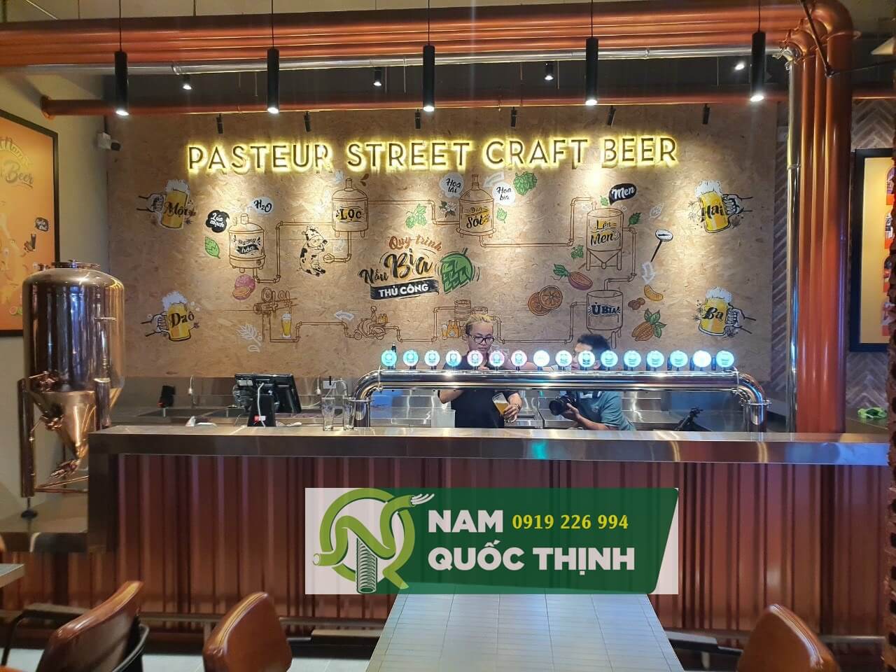 Ống thép luồn dây điện lắp đặt tại Pasteur Street Craft Beer với các phụ kiện kết nối đi kèm được lắp đặt thi công sản phẩm mỹ đạt chất lượng cao đi hệ thống điện chiếu sáng bên trong và bên ngoài, ống kẽm luồn dây điện đi kết nối với quạt trần, hệ thống âm thanh, camera quan sát, wifi tín hiệu cho toàn bộ cửa hàng nhìn rất chuyên nghiệp và đẳng cấp