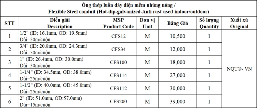 Bảng giá Ống ruột gà lõi thép + Thông số kỹ thuật Ống ruột gà lõi thép Nam Quốc Thịnh (Lưu ý: Giá áp dụng khi nhận được báo giá chính thức)